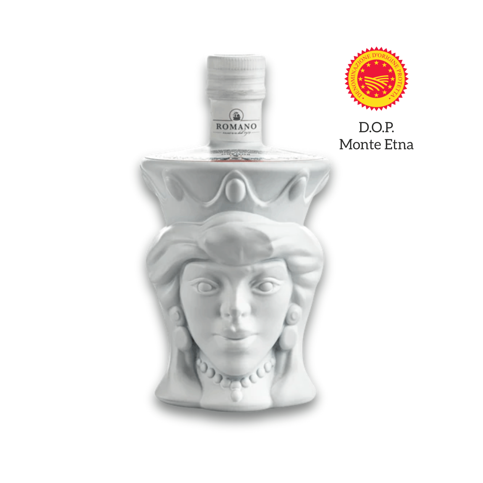 Sticlă ceramică albă tip „Testa di Moro”, simbol al culturii siciliene. Protejează uleiul de lumină și adaugă valoare estetică, fiind potrivită pentru servire directă pe masă sau pentru cadouri premium.